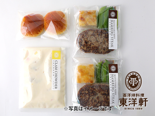 西洋御料理 東洋軒 松阪牛ハンバーグ&あさりのチャウダーセット 商品番号:TG1-01